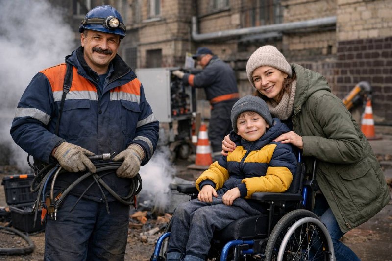 РОБІТНИК (привітно, практично): «Незабаром. Ми вас підʼєднаємо». (пауза, посмішка) «Третя будівля цього тижня… ще багато чого попереду. Ось так воно і є».