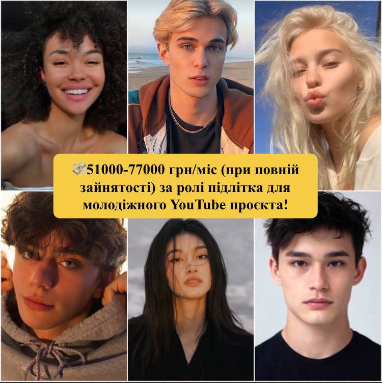 | | 19:44 |  💸51000-77000 грн/міс (при повній зайнятості) за роль підлітка для молодіжного YouTube проєкта!